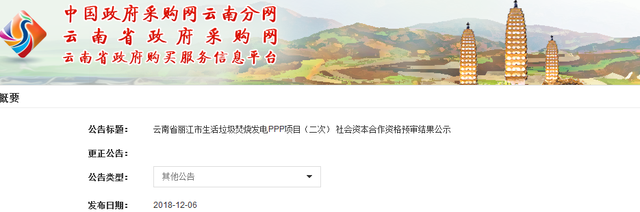 云南省麗江市生活垃圾焚燒發(fā)電PPP項(xiàng)目(二次)社會(huì)資本合作資格預(yù)審結(jié)果公示一、 云南省麗江市生活垃圾焚燒發(fā)電PPP項(xiàng)目(二次)于2018年11月13日至 2018年11月20日發(fā)布資格預(yù)審公告,到資格預(yù)審申請文件遞交截止時(shí)間2018年12月5日09時(shí)00分(北京時(shí)間)止,收到5家單位遞交的《資格預(yù)審...