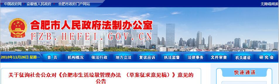 日前,合肥市發(fā)布了關(guān)于征詢社會公眾對《合肥市生活垃圾管理辦法 (草案征求意見稿)》意見的公告,詳情如下:為了提高立法透明度,充分聽取公眾的意見和建議,擴大政府立法的公眾參與,現(xiàn)將《合肥市生活垃圾管理辦法(草案征求意見稿)》全文向社會公布,公開征求公眾意見,期望廣大網(wǎng)友和有關(guān)單位積極發(fā)表修改意見和建議...