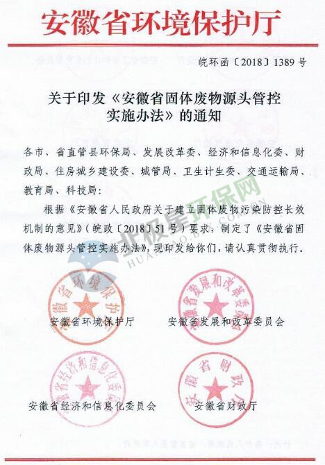 日前,安徽省發(fā)布《安徽省固體廢物源頭管控實施辦法》,詳情如下:關(guān)于印發(fā)《安徽省固體廢物源頭管控實施辦法》的通知各市、省直管縣環(huán)保局、發(fā)展改革委、經(jīng)濟(jì)和信息化委、財政局、住房城鄉(xiāng)建設(shè)委、城管局、衛(wèi)生計生委、交通運輸局、教育局、科技局:根據(jù)《安徽省人民政府關(guān)于建立固體廢物污染防控長效機制的意見》(皖政〔...