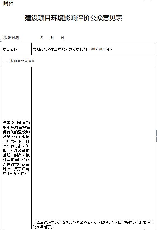 貴陽市城鄉(xiāng)生活垃圾分類專項規(guī)劃(2018-2022年)環(huán)境影響評價公眾參與信息公示根據《中華人民共和國環(huán)境影響評價法》、《環(huán)境影響評價公眾參與辦法》(生態(tài)環(huán)境部令 第4號)規(guī)定,現(xiàn)就貴陽市城鄉(xiāng)生活垃圾分類專項規(guī)劃(2018-2022年)環(huán)境影響評價信息進行第一次公示,歡迎公眾積極參與并提出寶貴意見。...