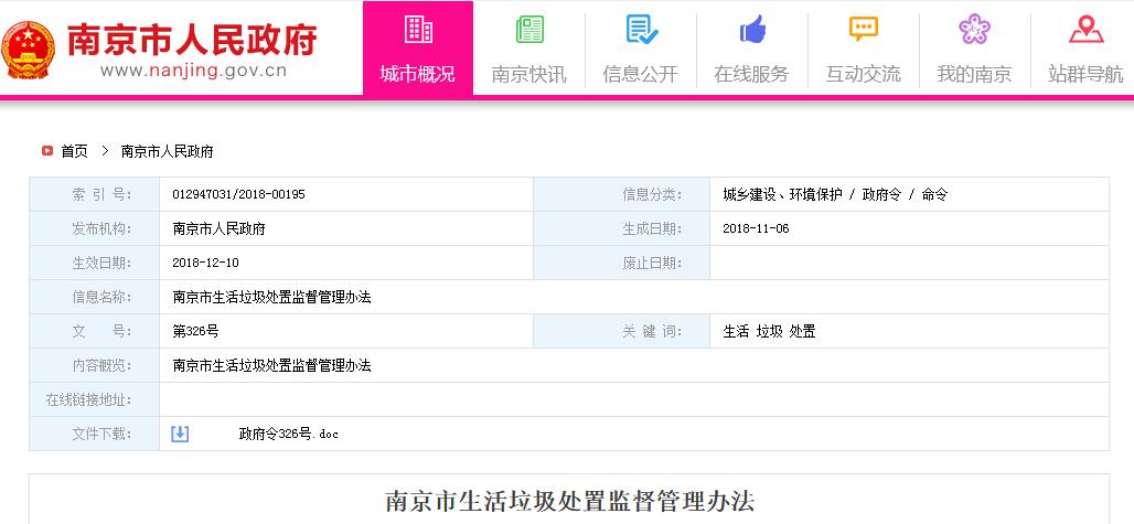 《南京市生活垃圾處置監(jiān)督管理辦法》日前公布,詳情如下:南京市生活垃圾處置監(jiān)督管理辦法第326號《南京市生活垃圾處置監(jiān)督管理辦法》已經(jīng)2018年10月31日市政府第23次常務(wù)會議審議通過,現(xiàn)予公布,自2018年12月10日起施行。市長:藍(lán)紹敏2018年11月6日南京市生活垃圾處置監(jiān)督管理辦法第一章 總...