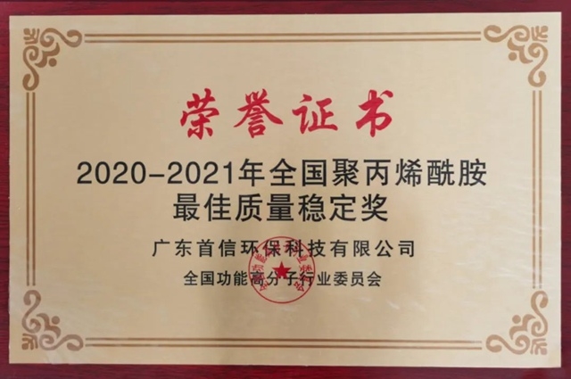 2020-2021年全國聚丙烯酰胺最佳質(zhì)量穩(wěn)定獎已出爐,本次獲得該項榮譽(yù)的是——廣東首信環(huán)保材料科技有限公司。可喜、可賀、更可嘆!首信環(huán)保獲全國聚丙烯酰胺最佳質(zhì)量穩(wěn)定獎 事實上,廣東首信環(huán)保材料科技有限公司(下稱“首信環(huán)保”)已經(jīng)不是第一次獲得該項榮譽(yù)...