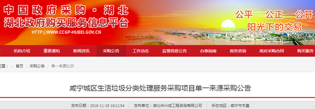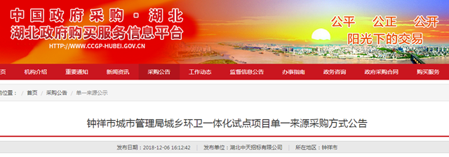 2018年12月6日,湖北省鐘祥市城鄉(xiāng)環(huán)衛(wèi)一體化試點(diǎn)項(xiàng)目發(fā)布單一來源采購方式公告,擬選擇單一來源供應(yīng)商為中國光大生態(tài)資源(香港)有限公司,項(xiàng)目預(yù)算2262萬/年。 據(jù)悉,項(xiàng)目的服務(wù)范圍以鐘祥市所轄的5個(gè)鄉(xiāng)鎮(zhèn)為試點(diǎn)(包括:舊口鎮(zhèn)、柴湖鎮(zhèn)、長(zhǎng)灘鎮(zhèn)、九里鄉(xiāng)、東橋鎮(zhèn))共計(jì)147個(gè)行政村,主要內(nèi)容包括農(nóng)村鎮(zhèn)區(qū)...