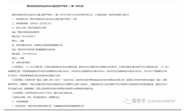 2018年12月10日,陜西省政府采購網(wǎng)對(duì)“西安市閻良區(qū)農(nóng)村生活污水治理工程PPP項(xiàng)目(一期)”中標(biāo)作公告,云南水務(wù)聯(lián)同云南省建設(shè)投資控股集團(tuán)有限公司成功中標(biāo)。 該項(xiàng)目以PPP模式運(yùn)作,將建設(shè)污水處理工程和污水收集管網(wǎng)工程,總投資約4億元。項(xiàng)目合作期限為30年,其中建設(shè)期2年...