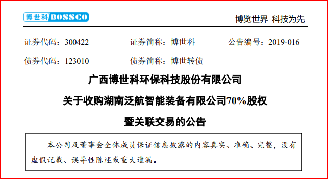 日前,廣西博世科環(huán)保科技股份有限公司(簡(jiǎn)稱(chēng)“博世科”)發(fā)布公告,公司擬收購(gòu)西藏廣博環(huán)保投資有限責(zé)任公司持有的湖南泛航智能裝備有限公司(簡(jiǎn)稱(chēng)“泛航裝備”)70%股權(quán)。本次收購(gòu)?fù)瓿珊?,泛航裝備將成為公司的控股子公司。 公告顯示,標(biāo)的公司泛航裝備成立于201...