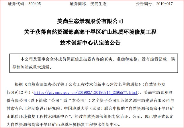 2019年2月18日,美尚生態(tài)景觀股份有限公司(簡(jiǎn)稱“美尚生態(tài)”)發(fā)布公告,公司全資子公司江蘇綠之源生態(tài)建設(shè)有限公司與甘肅有色工程勘察設(shè)計(jì)研究院、中國(guó)地質(zhì)大學(xué)(武漢)聯(lián)合申報(bào)的“自然資源部高寒干旱區(qū)礦山地質(zhì)環(huán)境修復(fù)工程技術(shù)創(chuàng)新中心”,經(jīng)過自然資源部組織...