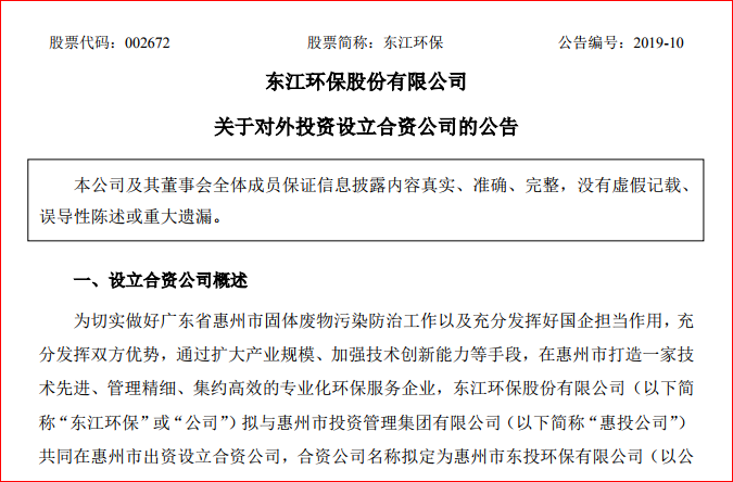 2019年1月24日,東江環(huán)保股份有限公司董事會發(fā)布公告稱,擬出資成立合資公司,打造一家專業(yè)化的環(huán)保服務(wù)企業(yè)。 公告顯示,東江環(huán)保擬與與惠州市投資管理集團(tuán)有限公司(簡稱“慧投公司”)共同出資在惠州市成立合資公司,公司名擬定為“惠州市東投環(huán)保有限公司”,...